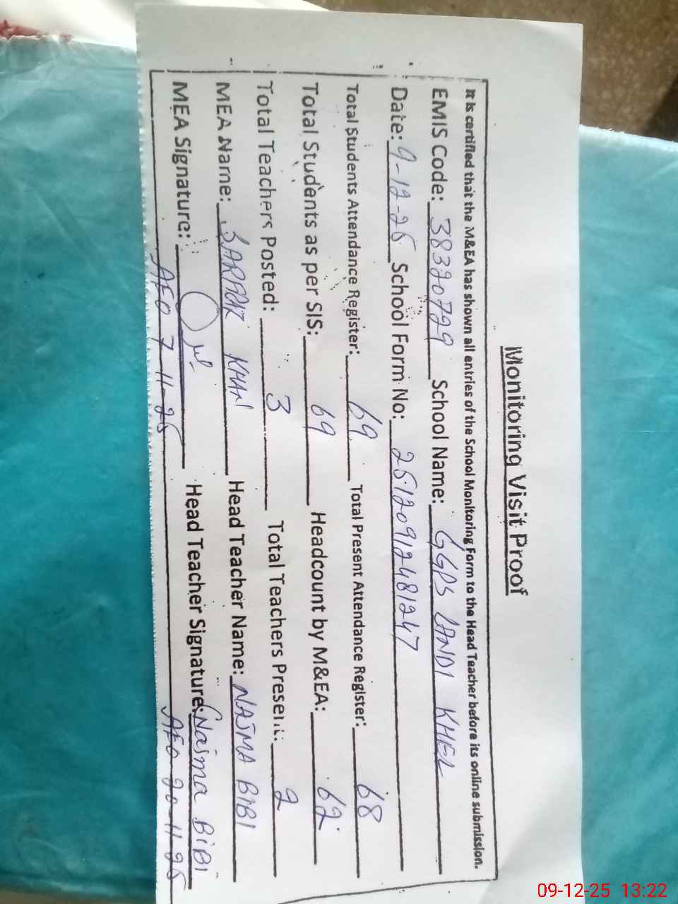 | Attendance Register | Head Teacher | MEA with School | Visit Proof |
