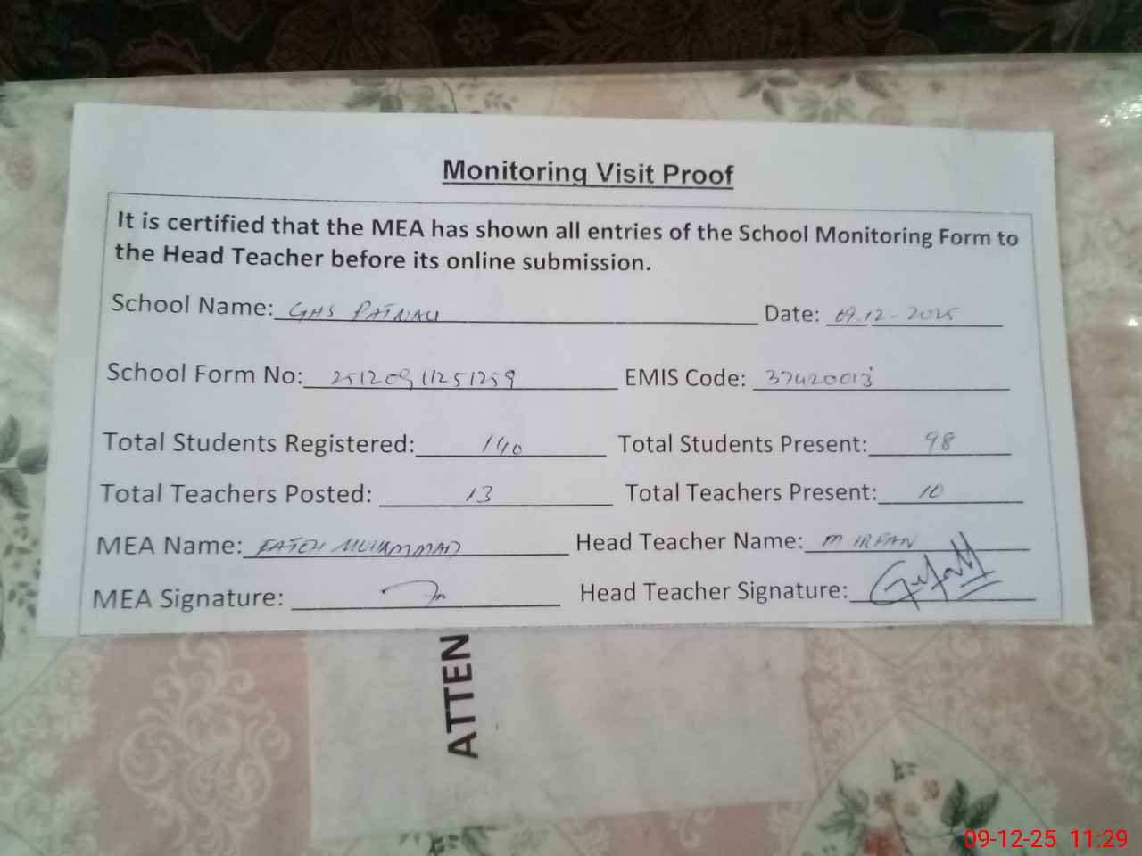 | Attendance Register | Head Teacher | MEA with School | Visit Proof |