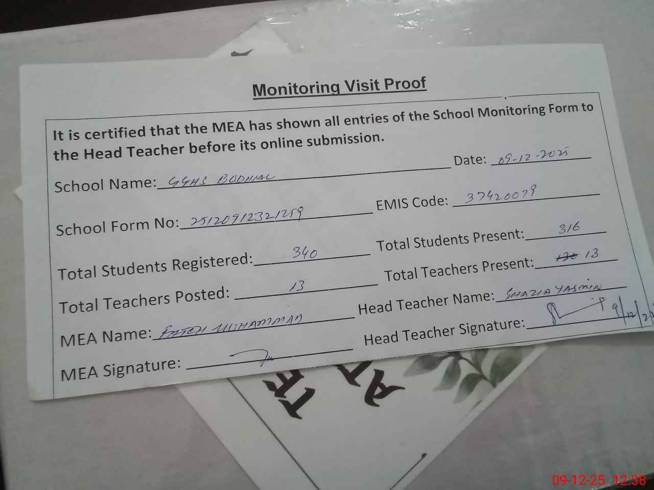 | Attendance Register | Head Teacher | MEA with School | Visit Proof |