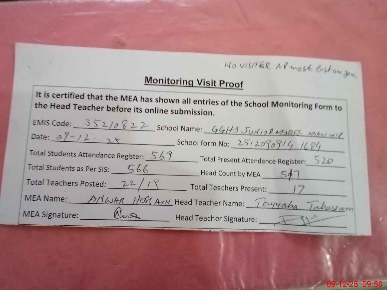 | EMIS Code: 35210822 | Name of School: GGHS JUNIOR MODEL MIAN MIR SAHIB (EX-MCL) | |||