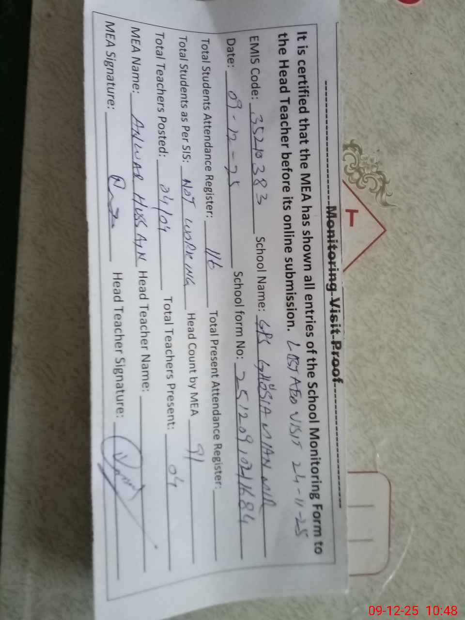 | Remarks (Use Separate Page if Required): Water tap missing on hand wash ECE class Room mentioned half portion of Class Room but not maintained properly only 02 student in ECE class AEO last visit on 24 November 2025 35210383 | |||||
