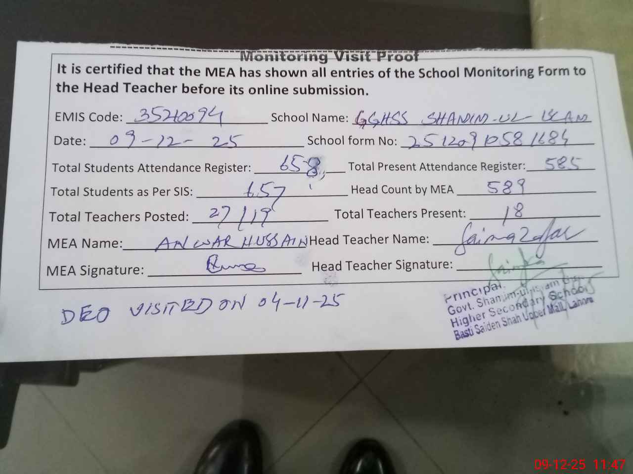 | Attendance Register | Head Teacher | MEA with School | Visit Proof |