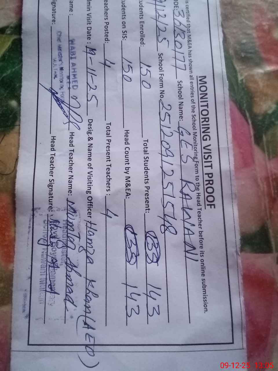 | Attendance Register | Head Teacher | MEA with School | Visit Proof |