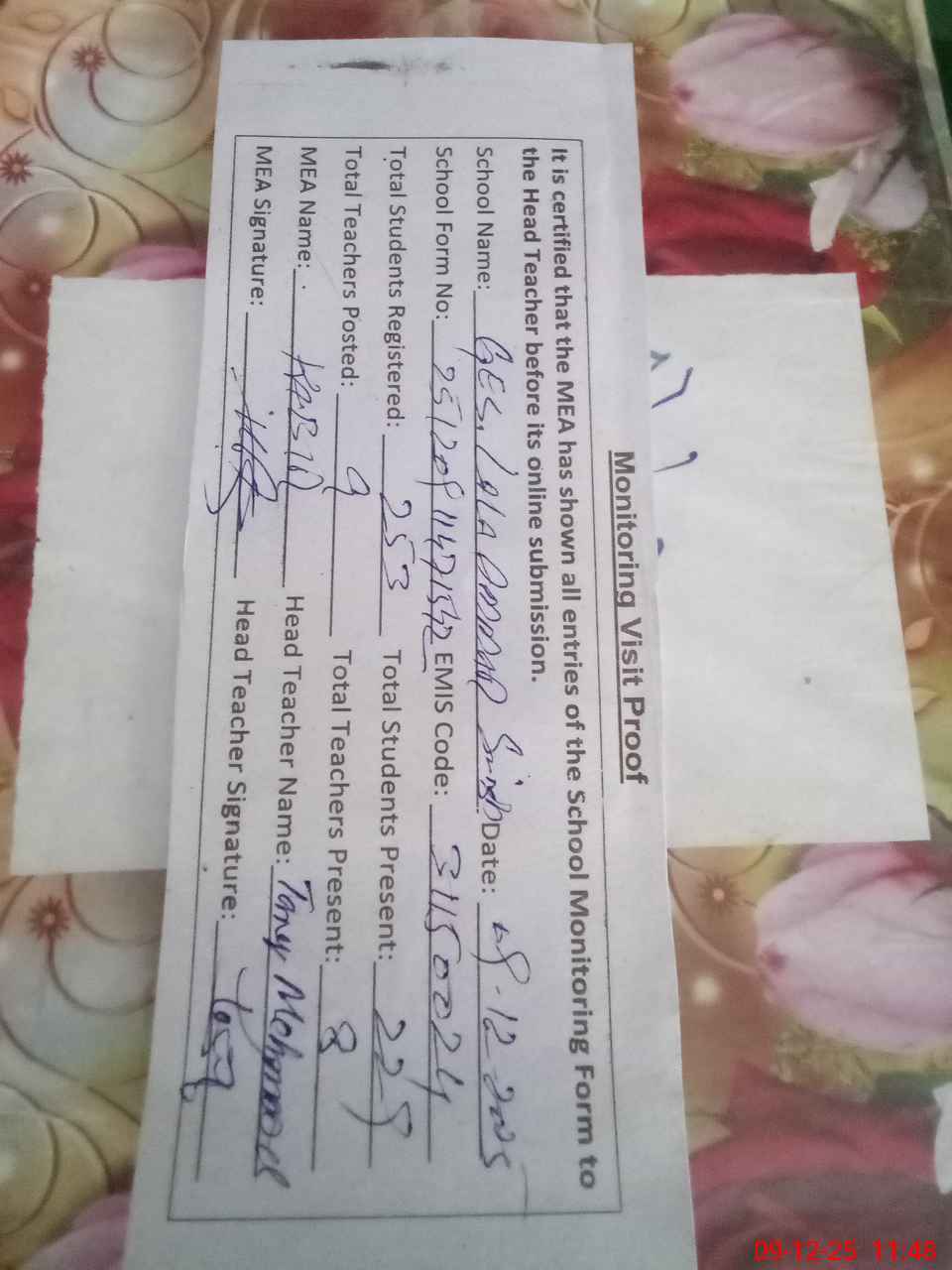 | Attendance Register | Head Teacher | MEA with School | Visit Proof |