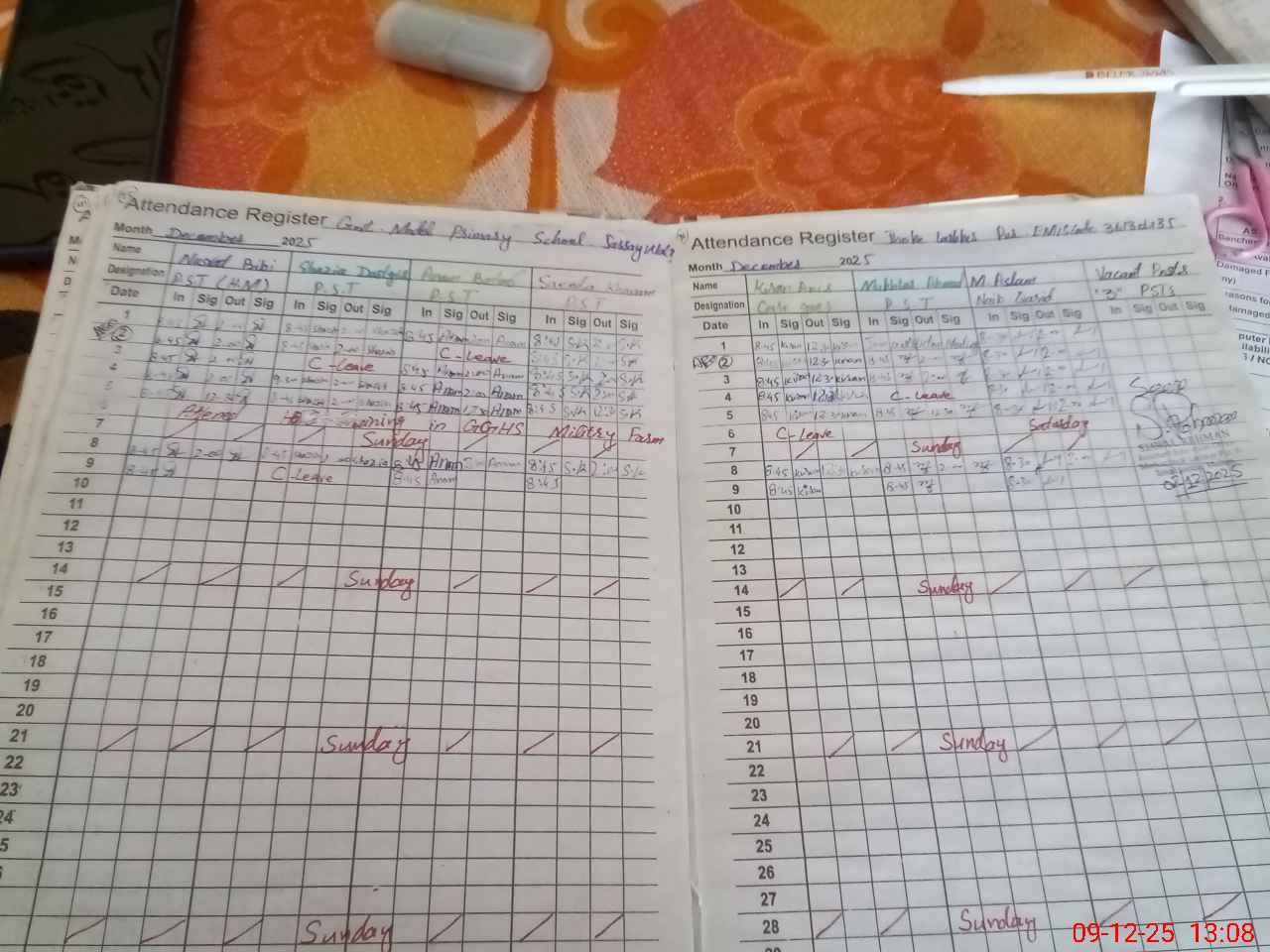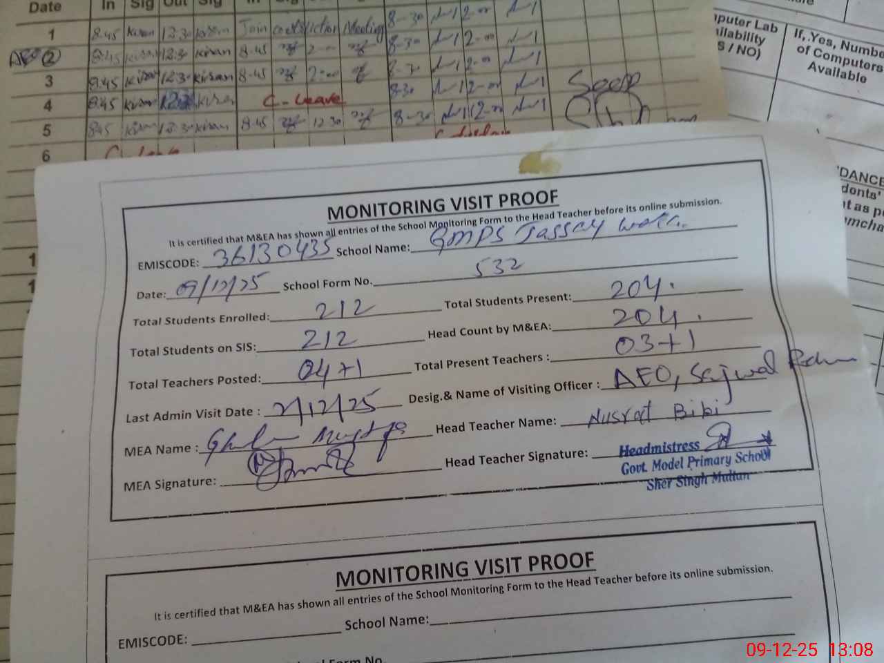 | Attendance Register | Head Teacher | MEA with School | Visit Proof |