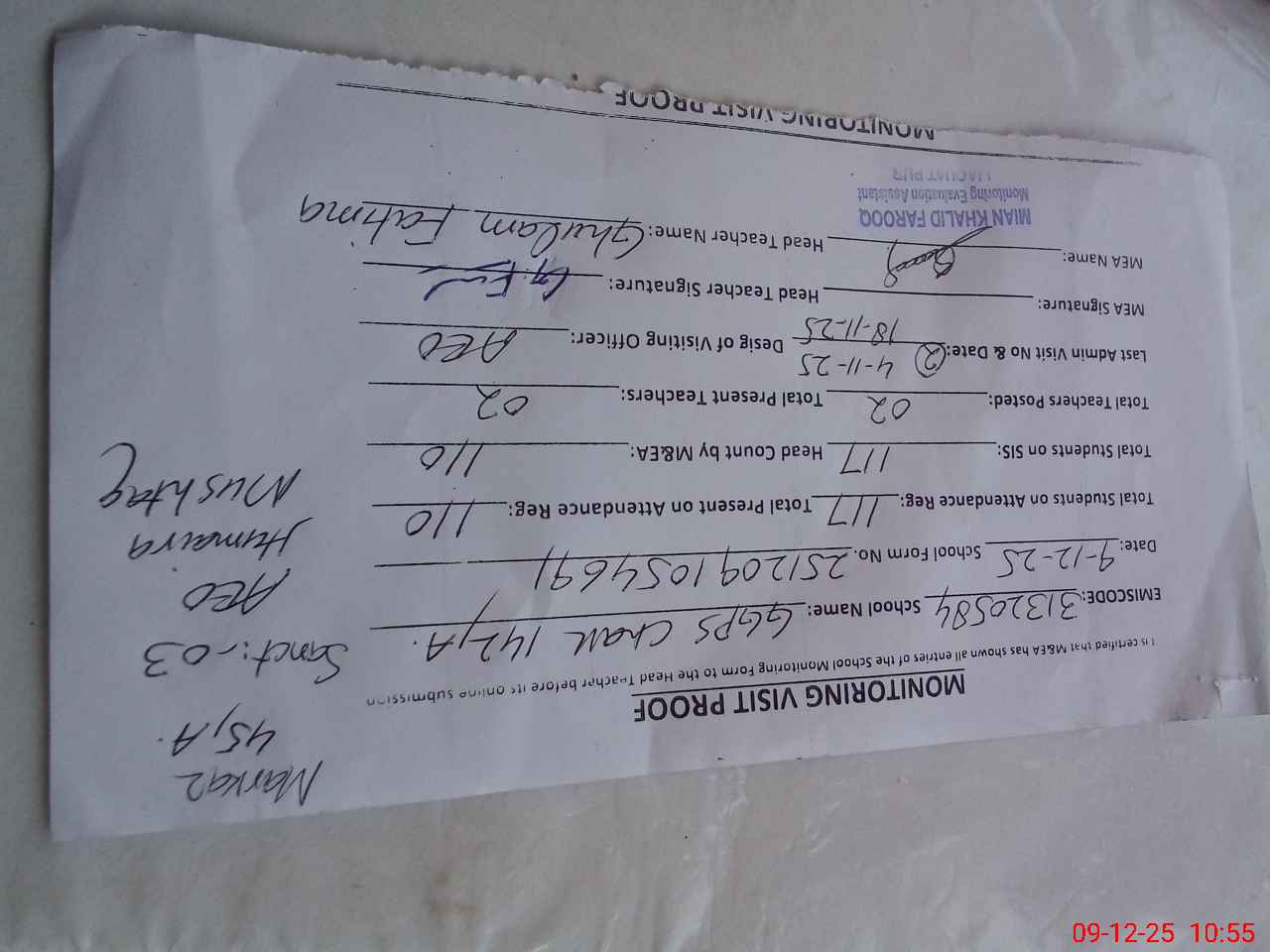 | Monitoring Date: 09-12-2025 | Start Time: 09-12-2025 10:36 AM | End Time: 09-12-2025 10:58 AM | Name of MEA: Kh**** Fa**** | |