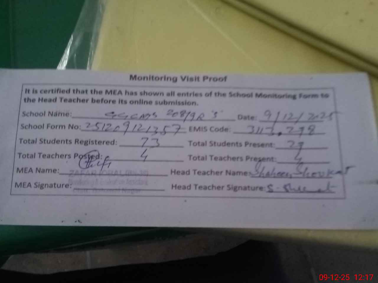 | Attendance Register | Head Teacher | MEA with School | Visit Proof |