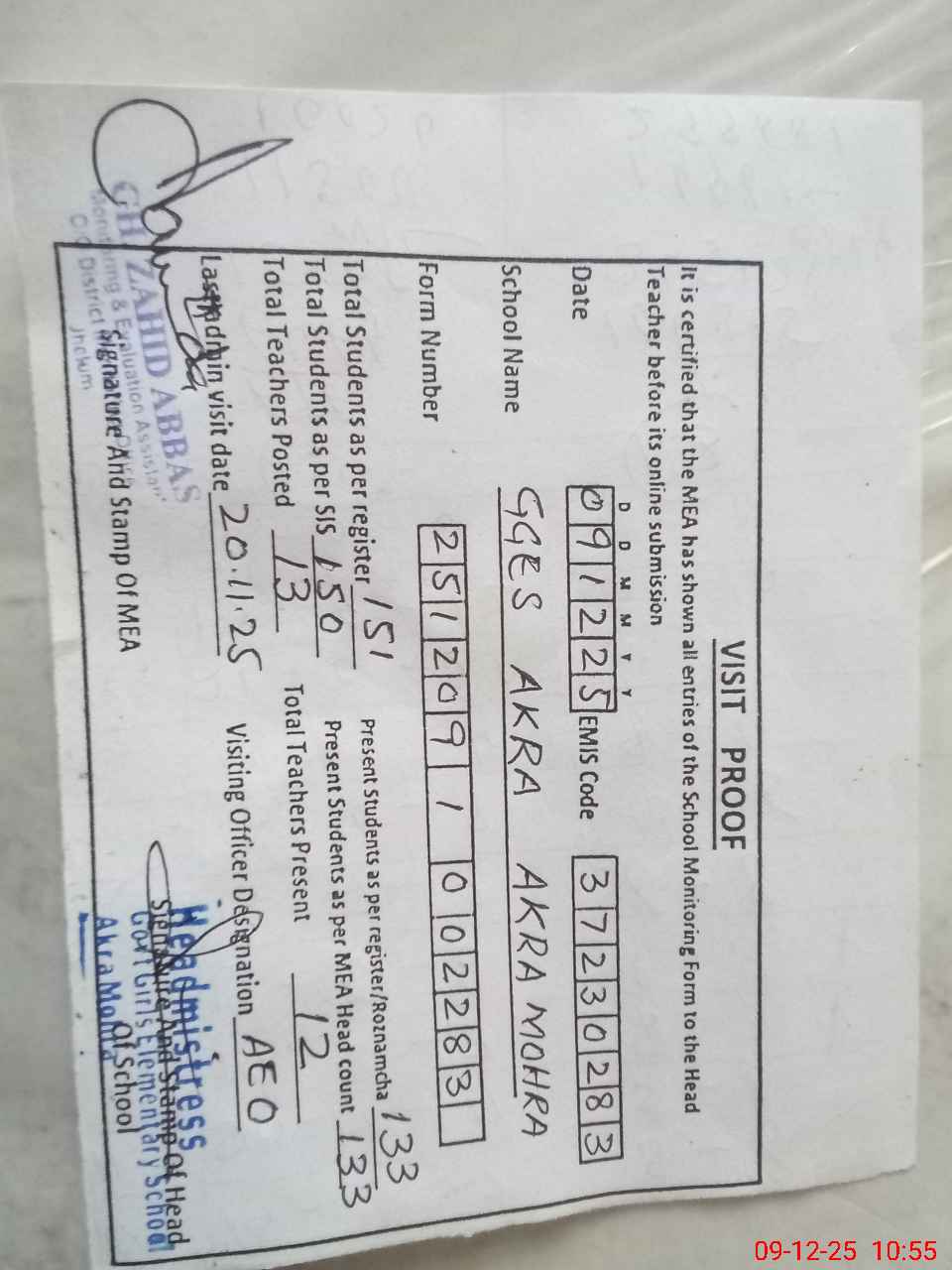 | Attendance Register | Head Teacher | MEA with School | Visit Proof |