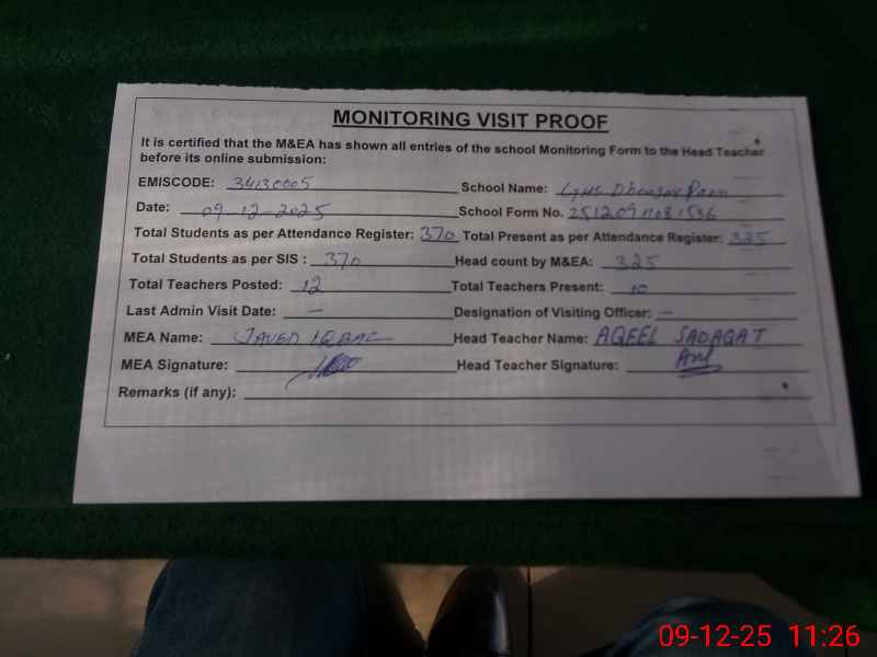 | Certified that this School was Inspected by the Undersigned MEA/DMO Today and the Information Stated Above is as Per Record. | |||||