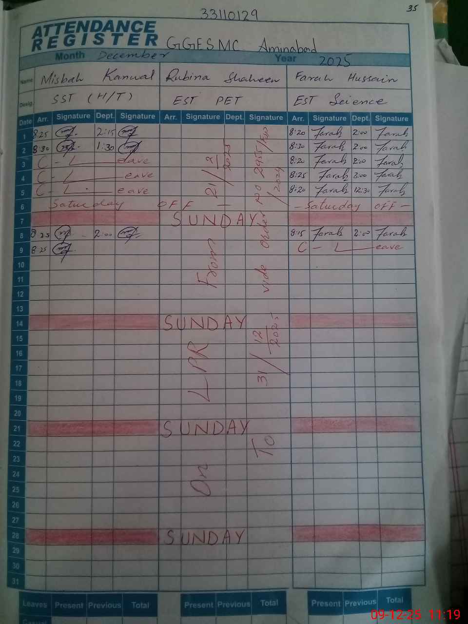 | 33**** | As**** Ma**** | SWEEPER | 3 | 0 | 0 | 0 | 0 | 0 | 0 | 0 | 3 | Casual | |