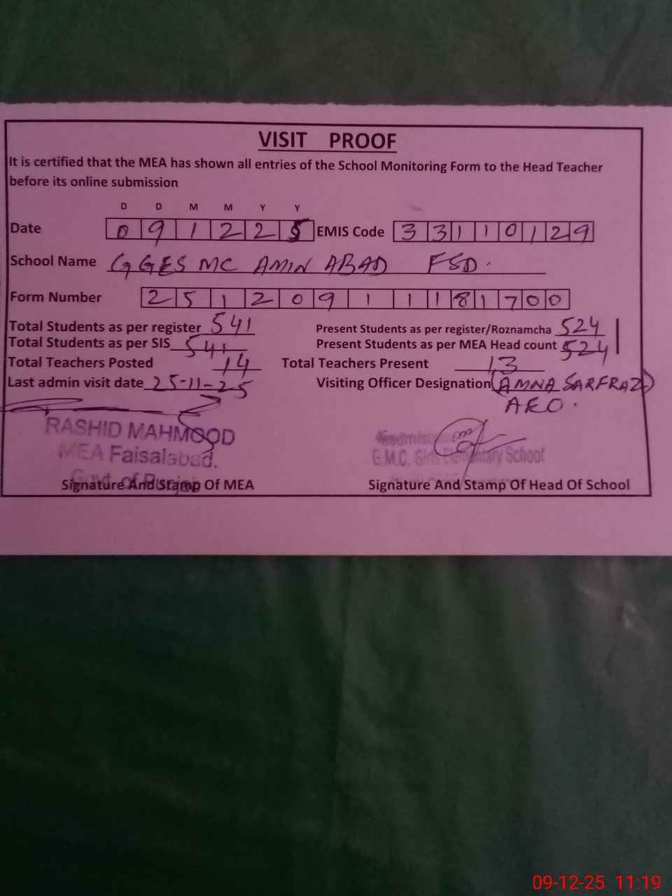 | Attendance Register | Head Teacher | MEA with School | Visit Proof |