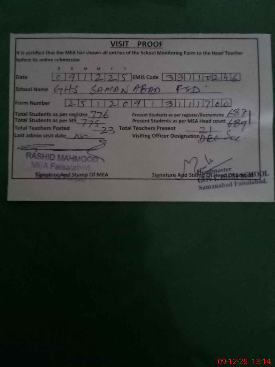 | Certified that this School was Inspected by the Undersigned MEA/DMO Today and the Information Stated Above is as Per Record. | |||||