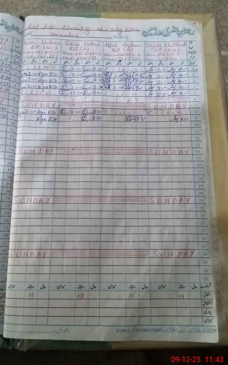 | CNIC | Full Name | Designation | R/C | Absence During Last Calender Month |