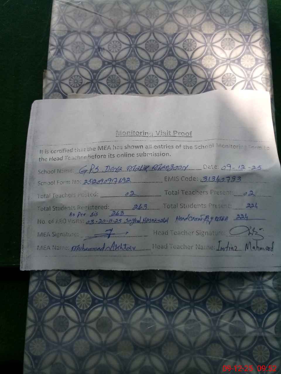 | Attendance Register | Head Teacher | MEA with School | Visit Proof |