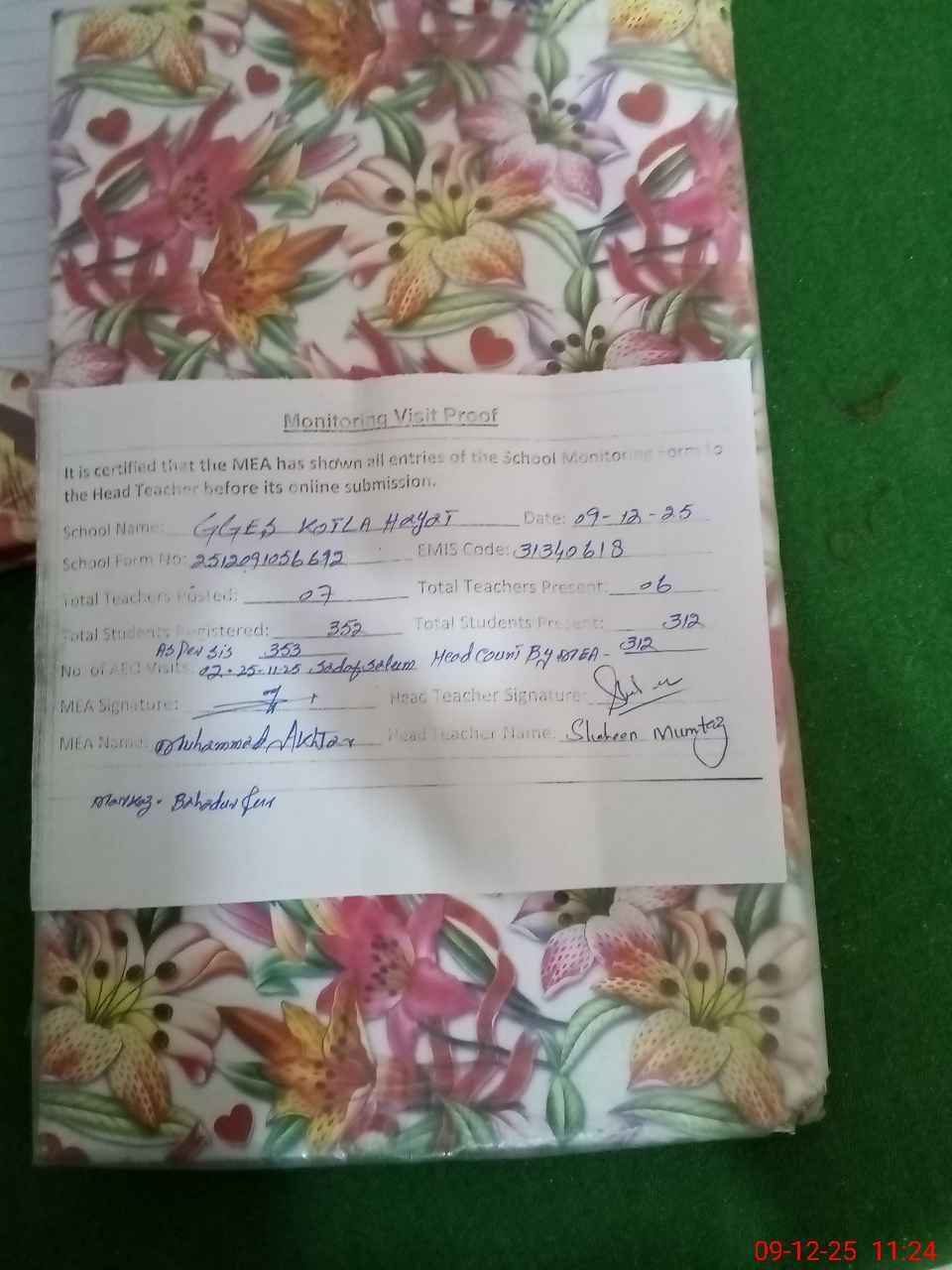 | Attendance Register | Head Teacher | MEA with School | Visit Proof |