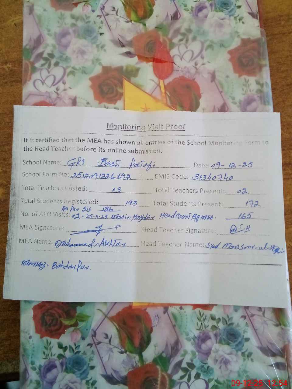 | Attendance Register | Head Teacher | MEA with School | Visit Proof |
