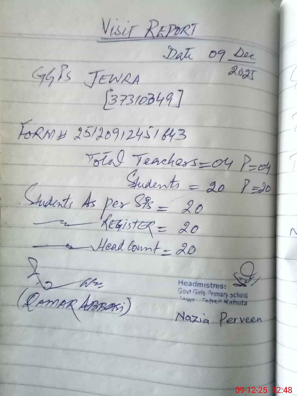 | Attendance Register | Head Teacher | MEA with School | Visit Proof |