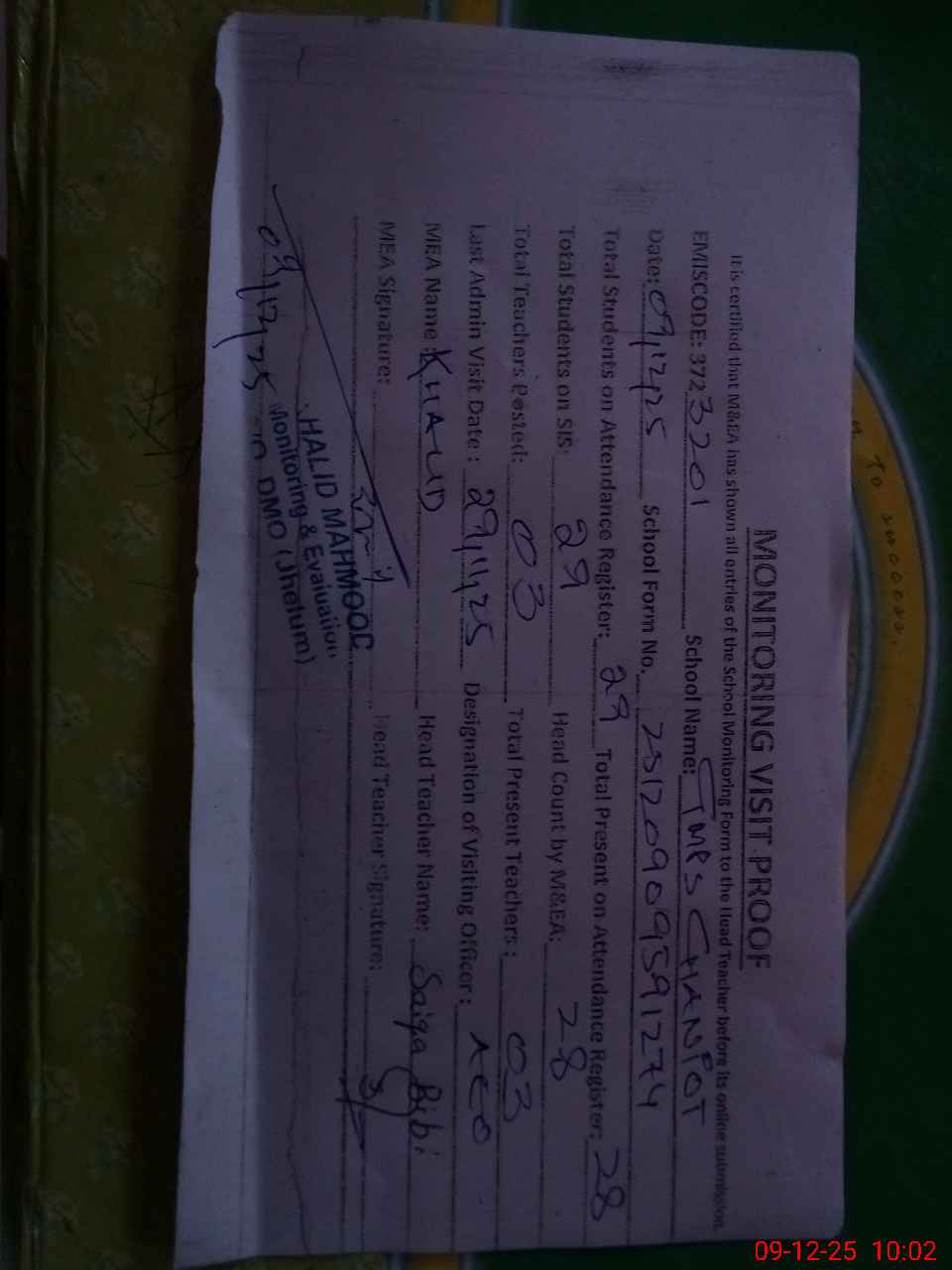 | Attendance Register | Head Teacher | MEA with School | Visit Proof |