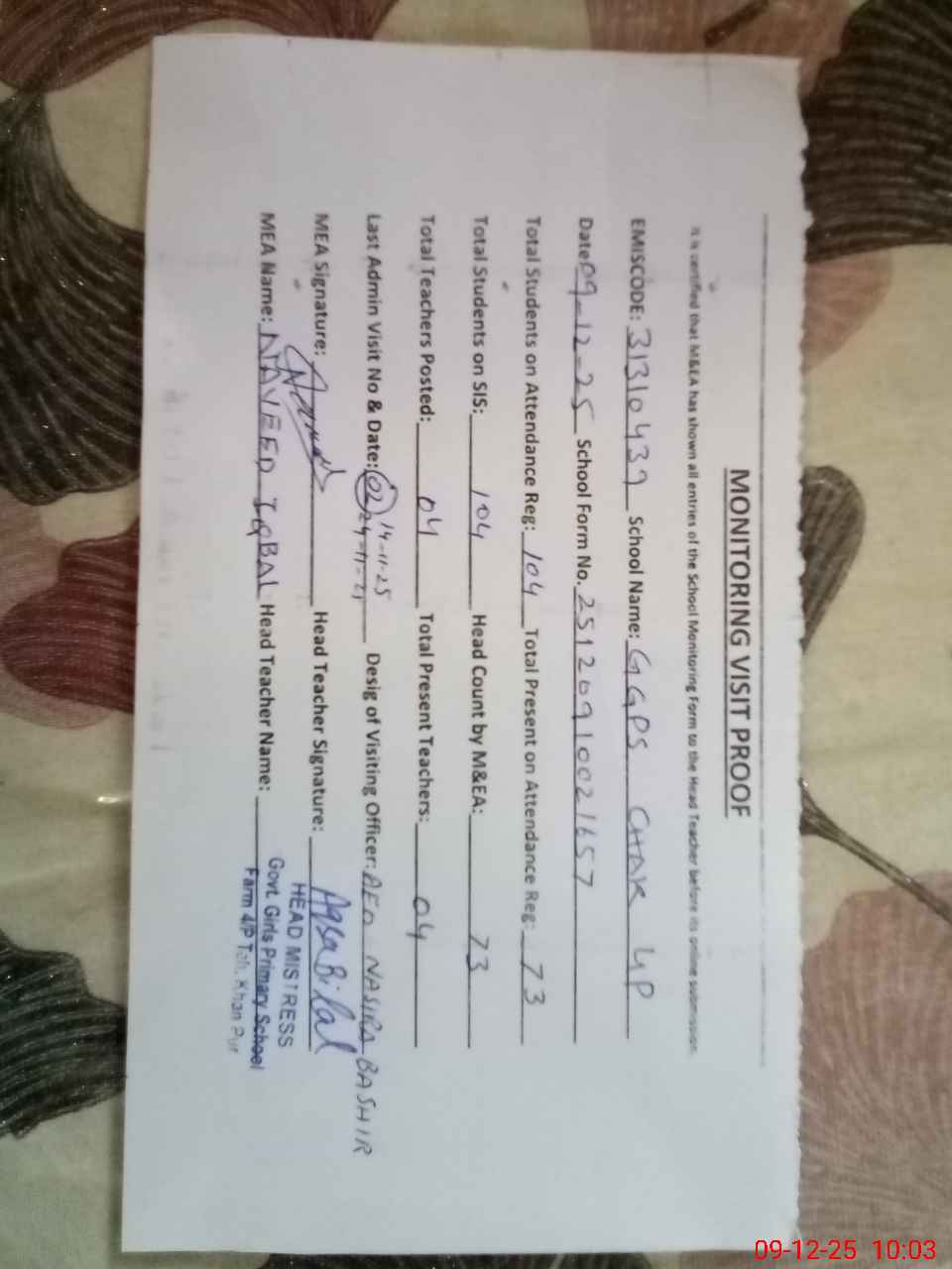 | EMIS Code: 31310439 | Name of School: GGPS CHAK NO 4/P | |||