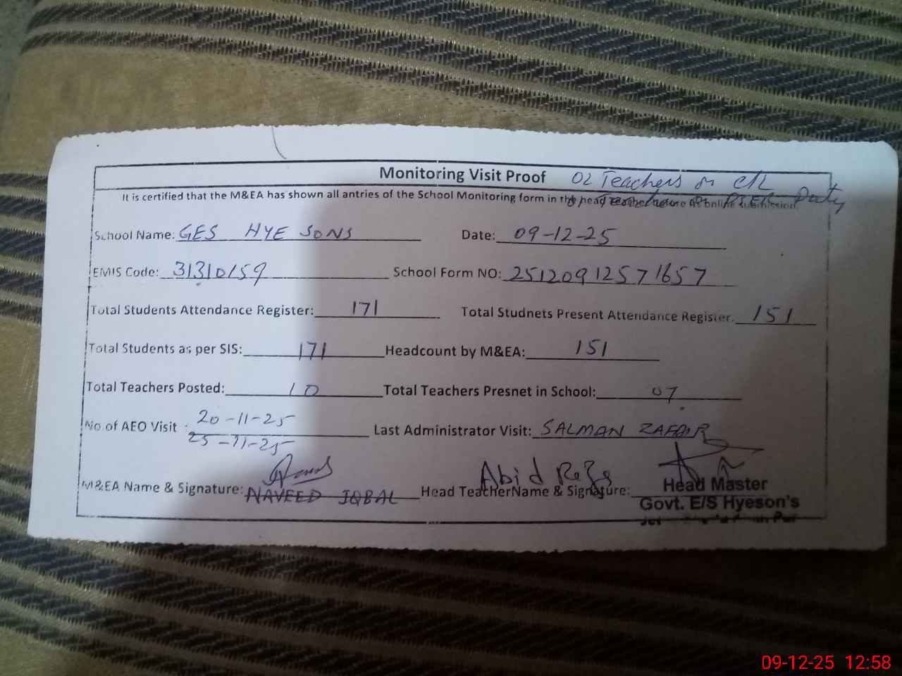 | Attendance Register | Head Teacher | MEA with School | Visit Proof |