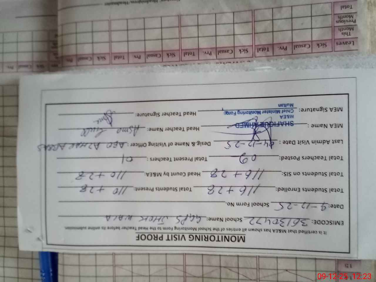 | Attendance Register | Head Teacher | MEA with School | Visit Proof |