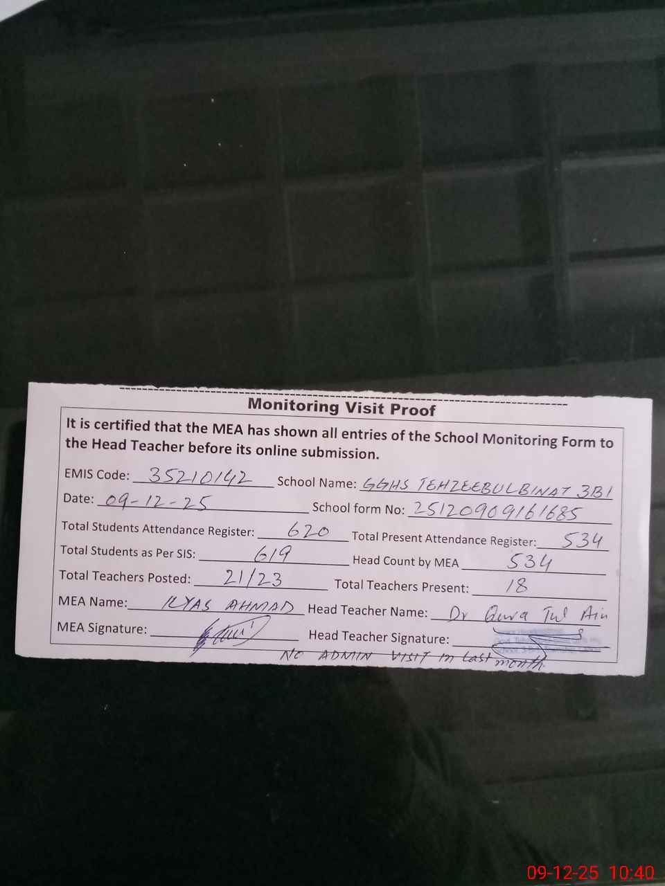 | Remarks (Use Separate Page if Required): Teacher Tasleem Akhtar EST Arabic long absent wef 26 May 2025 01 room under construction since July 2022 still work is pending AEO visit on 27 October 2025 | |||||