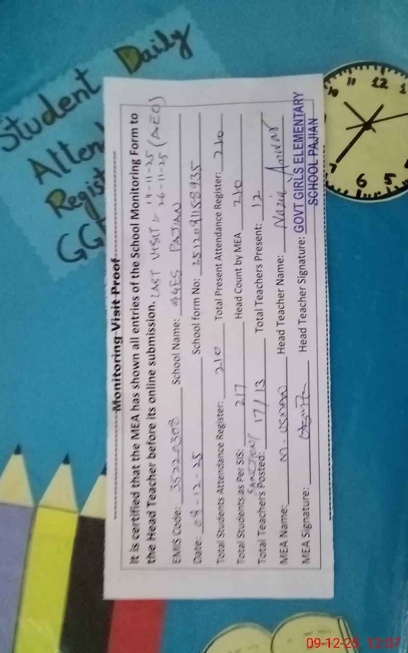 | Attendance Register | Head Teacher | MEA with School | Visit Proof |