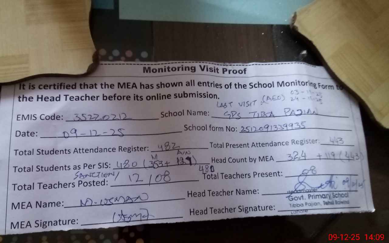 | Attendance Register | Head Teacher | MEA with School | Visit Proof |