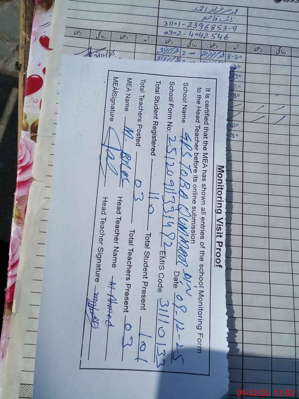| EMIS Code: 31110133 | Name of School: GPS TOBA QUMMAR DIN | |||