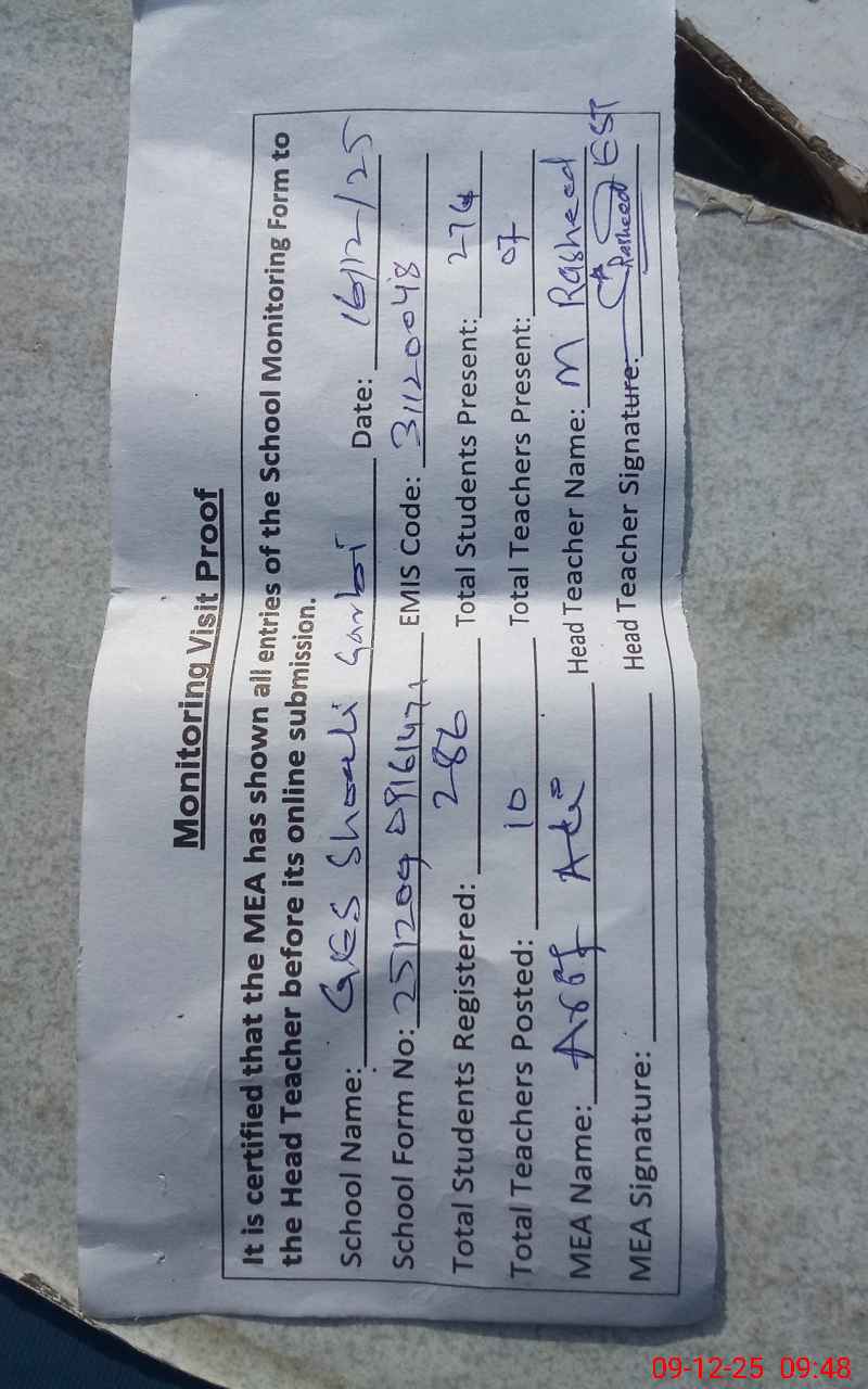 | Attendance Register | Head Teacher | MEA with School | Visit Proof |