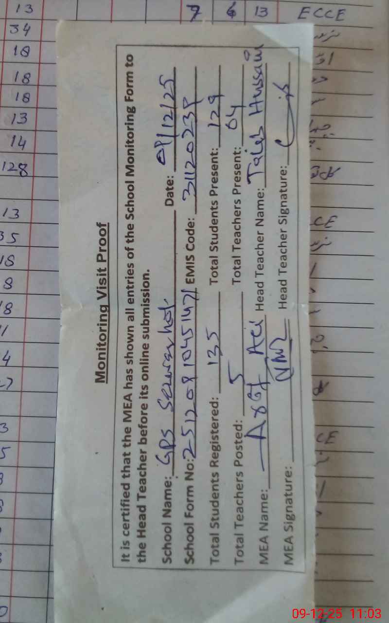 | Attendance Register | Head Teacher | MEA with School | Visit Proof |