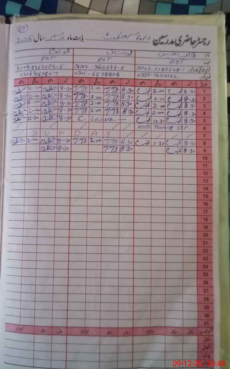 | CNIC | Full Name | Designation | R/C | Absence During Last Calender Month |