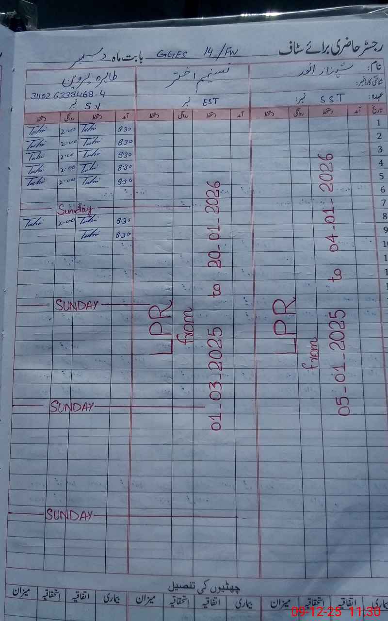 | CNIC | Full Name | Designation | R/C | Absence During Last Calender Month |