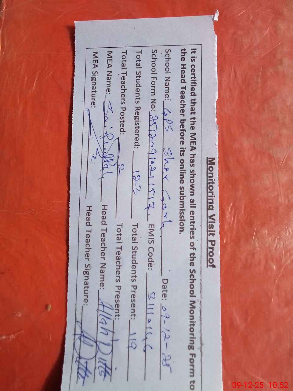| Attendance Register | Head Teacher | MEA with School | Visit Proof |