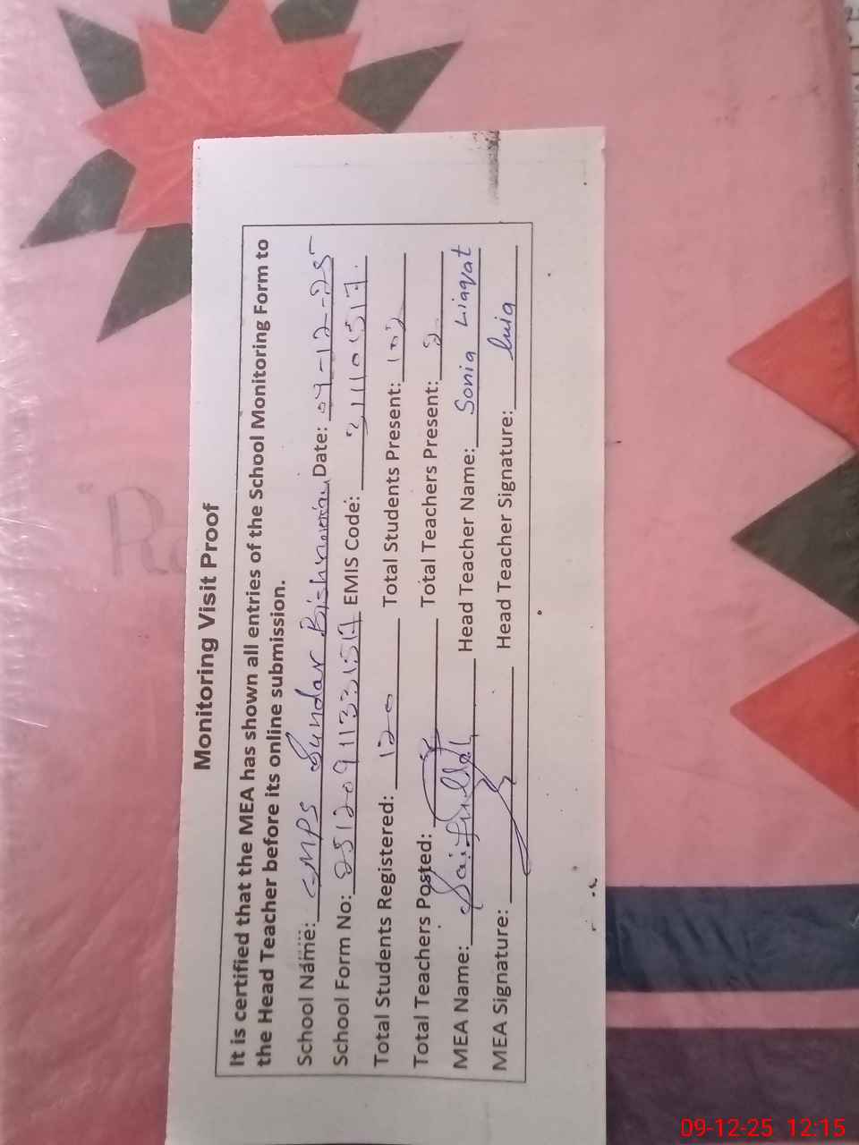 | Attendance Register | Head Teacher | MEA with School | Visit Proof |