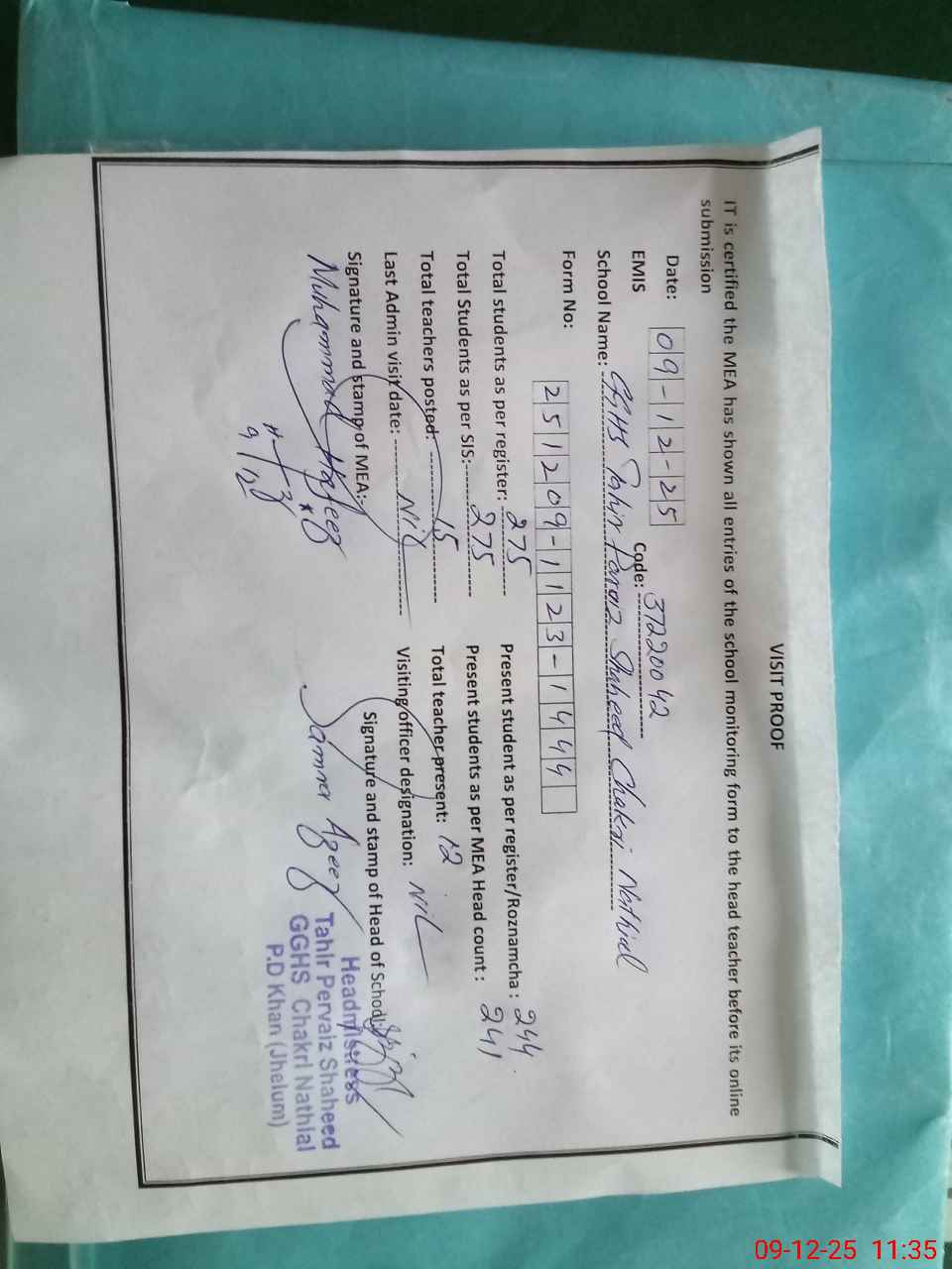 | Attendance Register | Head Teacher | MEA with School | Visit Proof |
