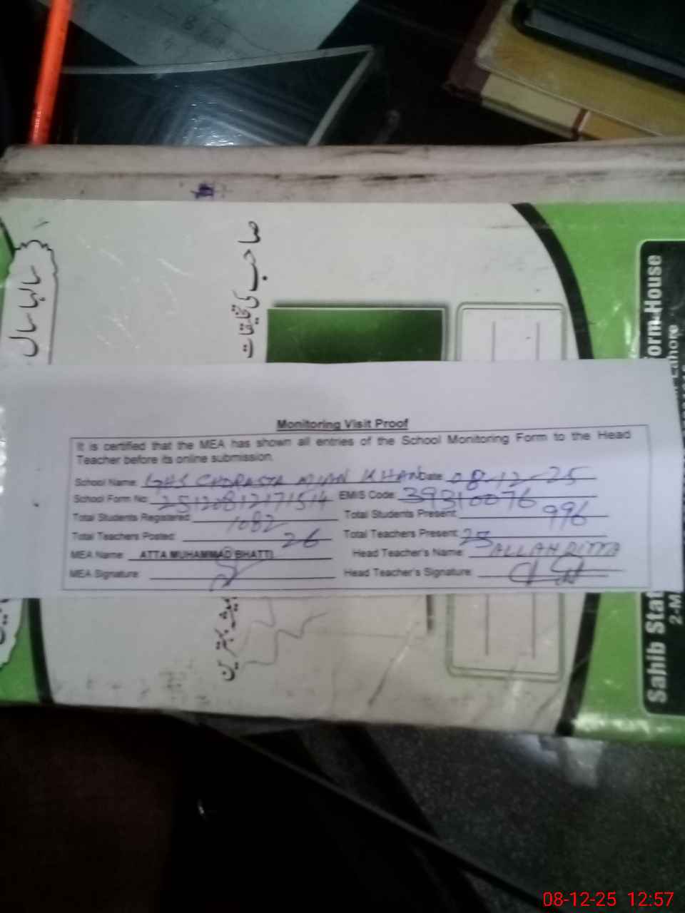 | Attendance Register | Head Teacher | MEA with School | Visit Proof |