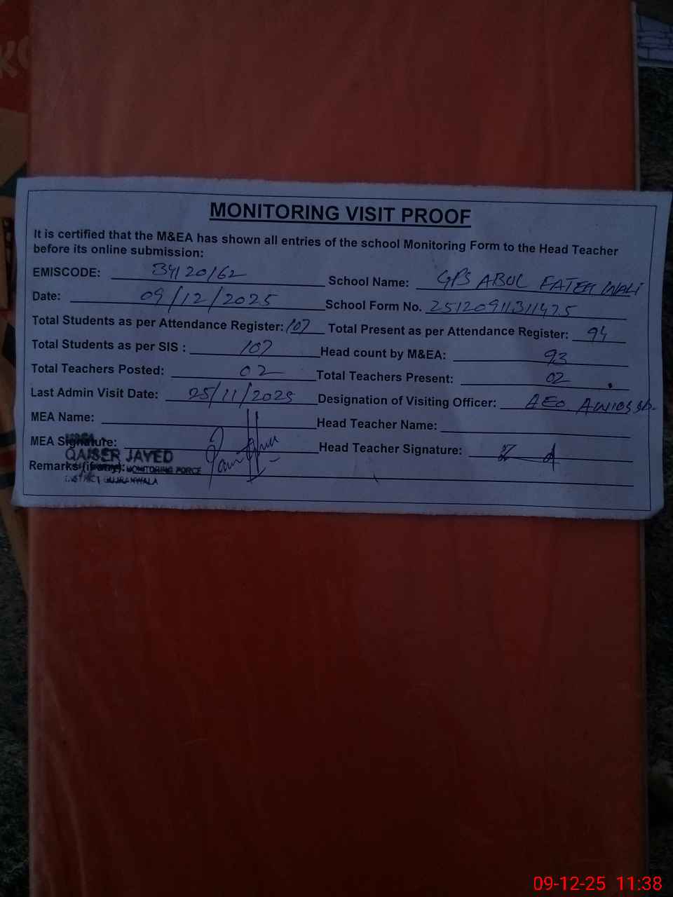 | EMIS Code: 34120162 | Name of School: GPS ABUL FATEH WALI | |||