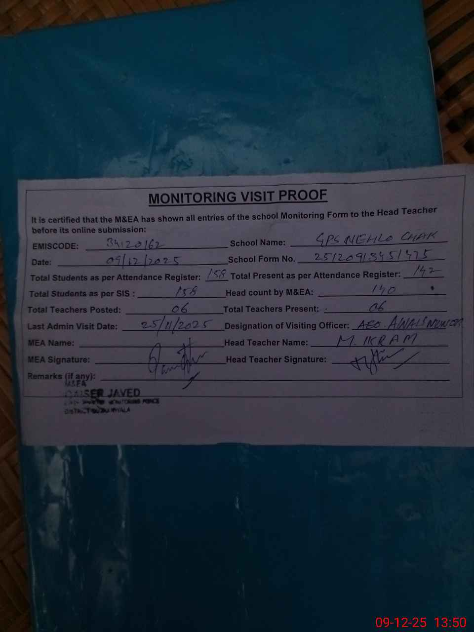 | Attendance Register | Head Teacher | MEA with School | Visit Proof |