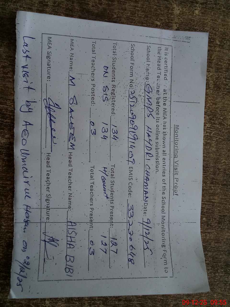 | Attendance Register | Head Teacher | MEA with School | Visit Proof |