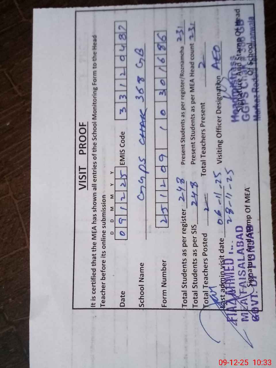 | Certified that this School was Inspected by the Undersigned MEA/DMO Today and the Information Stated Above is as Per Record. | |||||