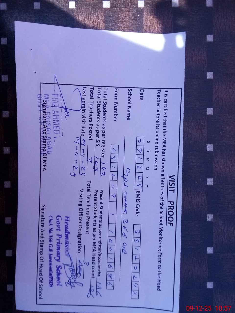 | Attendance Register | Head Teacher | MEA with School | Visit Proof |