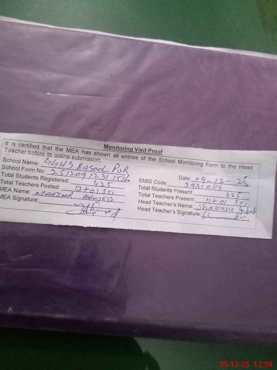 | Attendance Register | Head Teacher | MEA with School | Visit Proof |