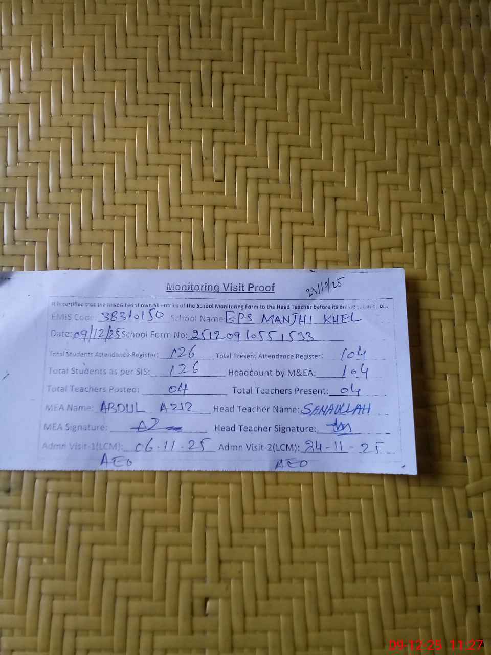 | Attendance Register | Head Teacher | MEA with School | Visit Proof |