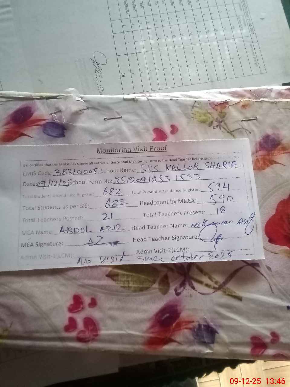| Attendance Register | Head Teacher | MEA with School | Visit Proof |