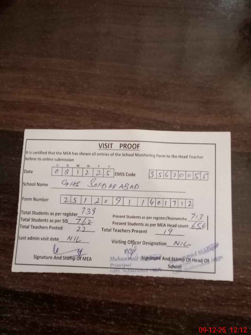 | Attendance Register | Head Teacher | MEA with School | Visit Proof |