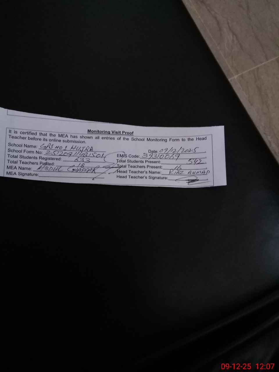 | Attendance Register | Head Teacher | MEA with School | Visit Proof |
