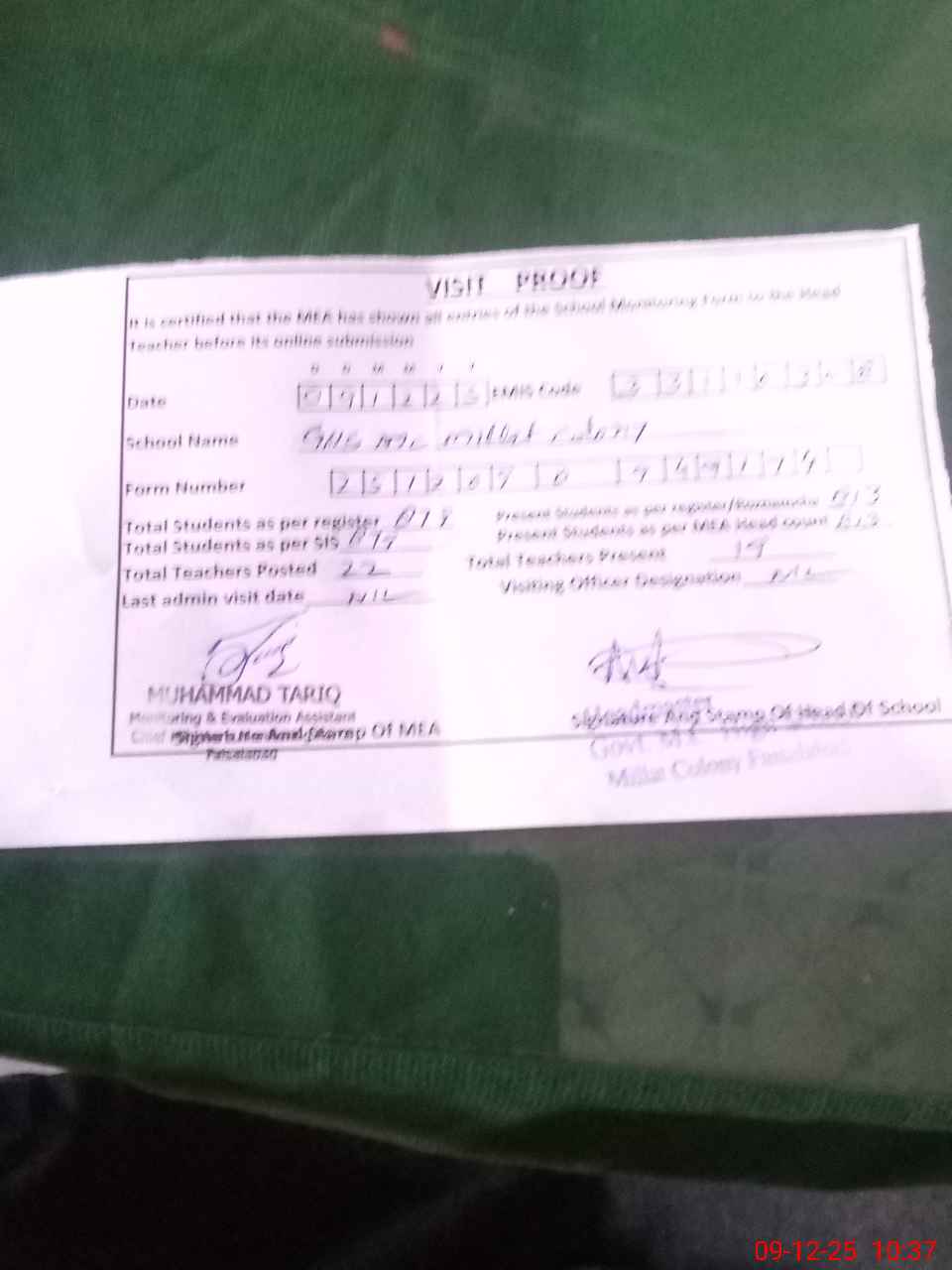 | EMIS Code: 33110308 | Name of School: GHS MC MILLAT COLONY FSD | |||