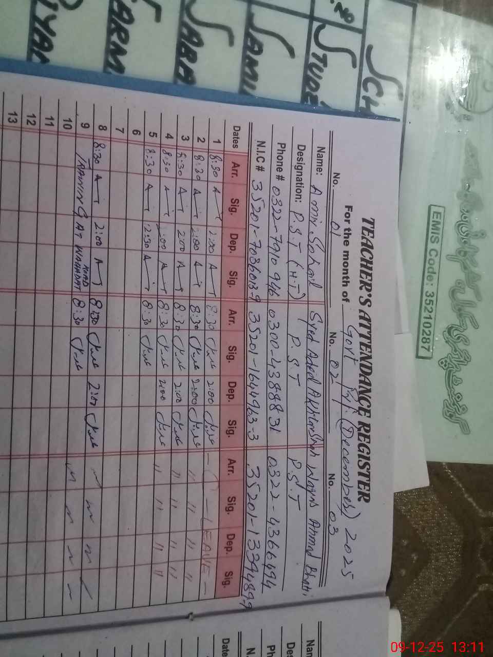 | CNIC | Full Name | Designation | R/C | Absence during last cal. month |