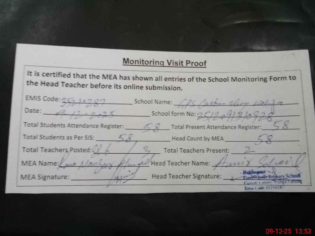 | Attendance Register | Head Teacher | MEA with School | Visit Proof |